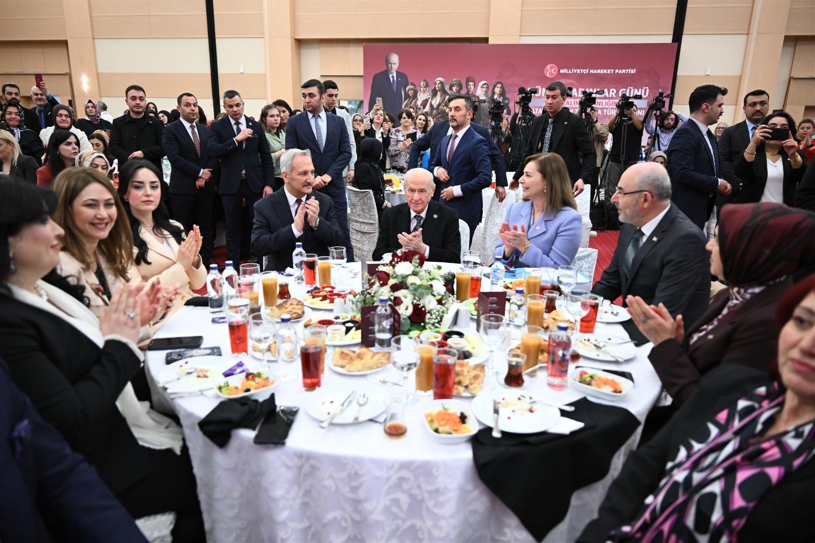 Programda bir konuşma yapan MHP Lideri Bahçeli, Türk kadınının tarih boyunca devletin, milletin ve ailenin temel direği olduğunu vurguladı . Bahçeli, kadınların fedakârlığı, emeği ve azmiyle toplumun her alanında önemli rol üstlendiğini ifade ederek, "Kadın, Türk milletinin teminatıdır. Türk kadını fedakârlığın, sabrın ve vefanın adıdır" dedi .